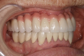 • 【治療後】上あごにはインプラント固定式の歯が入りました。下あごは奥歯をインプラントで,前歯はセラミッククラウンで回復しました。見違えるように綺麗になり,食事が楽しくなったとのコメントをいただきました。